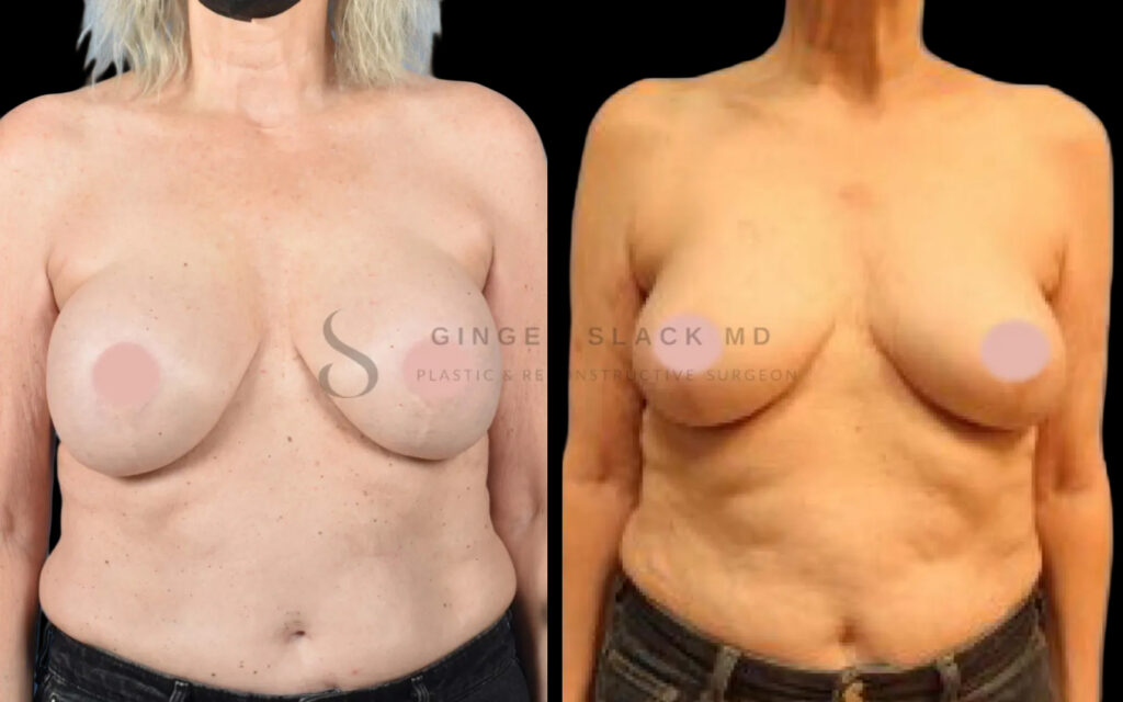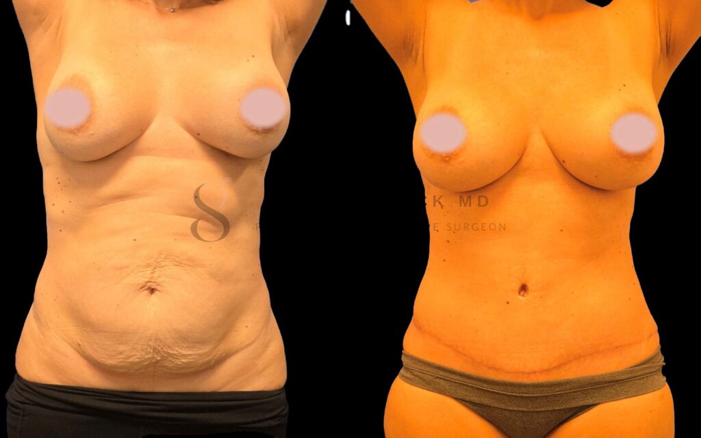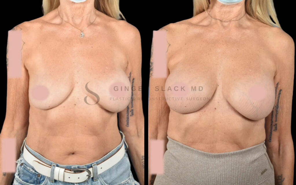 Patient had severe hypomastia, or underdevelopment of the breasts. This patient desired a breast augmentation and selected saline implants (Natrelle, 390 cc, moderate profile) placed in a dual plane, through a hidden inframammary fold incision. She also had fat grafting to the cleavage lines.